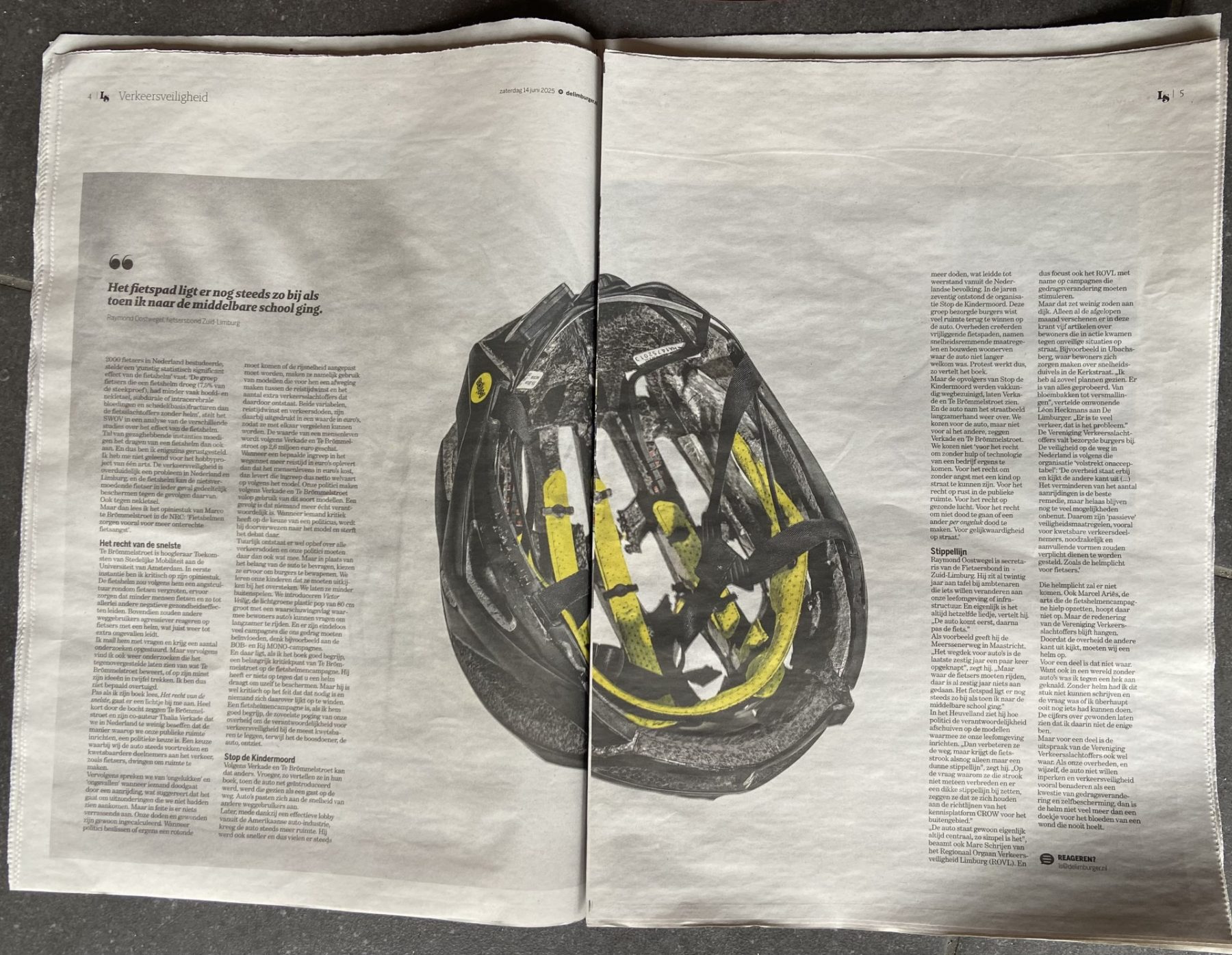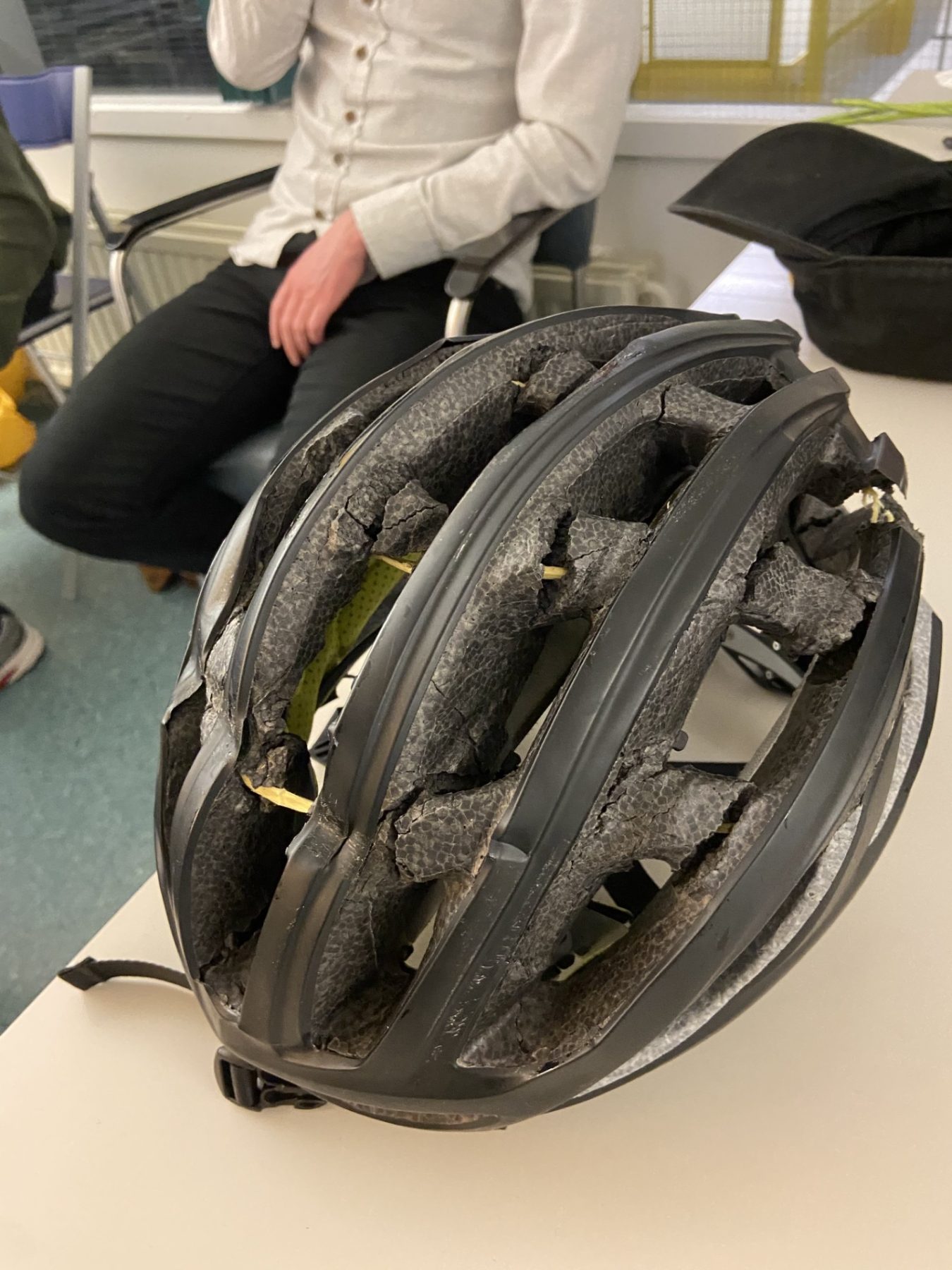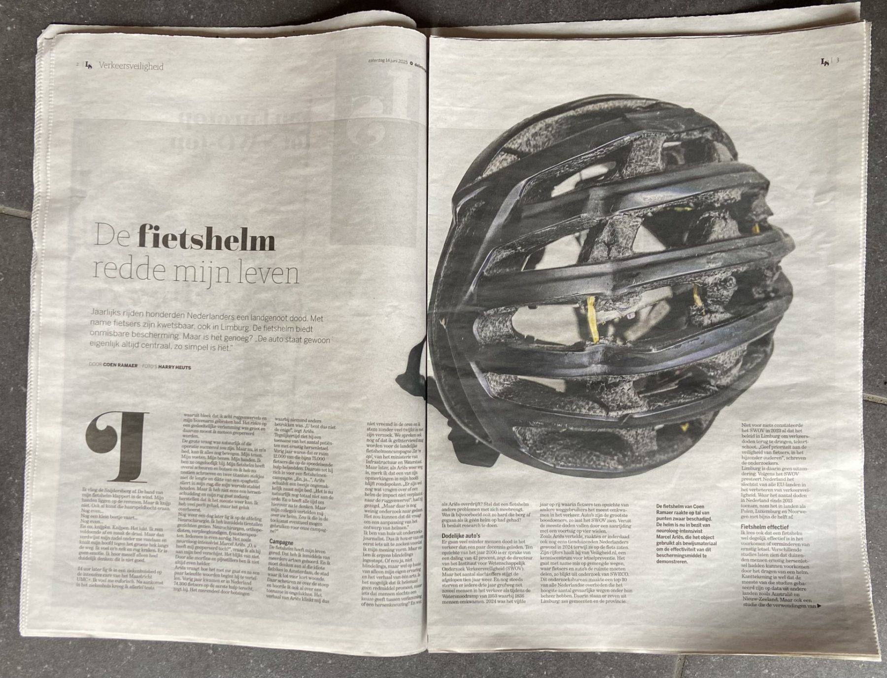 Een paar weken geleden ging ik weer eens hard de heuvel af toen het mis ging. Geen idee wat er precies gebeurde, maar ik vloog over mijn stuur en met mijn hoofd tegen een massief hekwerk. Mijn fiets is nog helemaal intact, mijn helm niet.’ Coen breekt zes ruggenwervels, een rib en zijn linker bovenarm. ‘Maar ik heb geen hersenschudding. Mijn helm heeft me echt gered, er zitten enorme deuken en barsten in. Ik ben nu aan het revalideren en ben zo blij dat mijn hoofd helder is. De kans is groot dat ik vanaf nu altijd een helm draag, ook als ik op mijn stadfiets naar de supermarkt ga.’